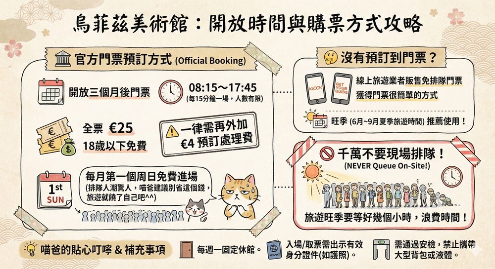 烏菲茲美術館絕對是佛羅倫斯不可錯過的最重要景點之一,可是該怎麼買票預約?如何避開人潮?烏菲茲美術館的參觀重點是甚麼?又有哪些鎮館之寶?這篇就獻上喵爸喵媽的烏菲茲美術館參觀攻略^^