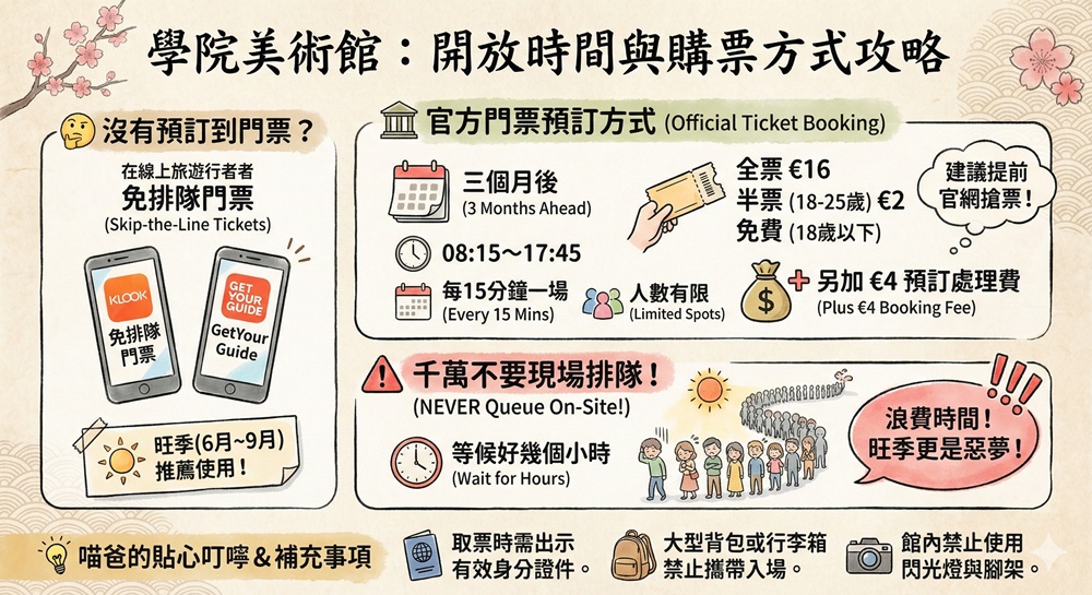 學院美術館入場分成兩邊,事先預約買票的遊客排左邊(就算旅遊旺季也只要等候5~10分鐘);排隊排到天荒地老的右側就是現場買票的遊客(旅遊旺季要等好幾個小時),所以喵爸再次提醒:千萬一定要先買票!