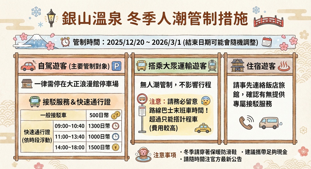 為了應付越來越多觀光客,近年在冬天旺季也開始祭出管制措施,今年主要針對的對象是自駕的遊客。