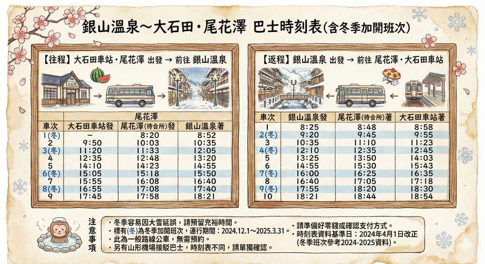 【銀山溫泉交通】電車轉乘方式、巴士時刻表與冬季人潮管制規定