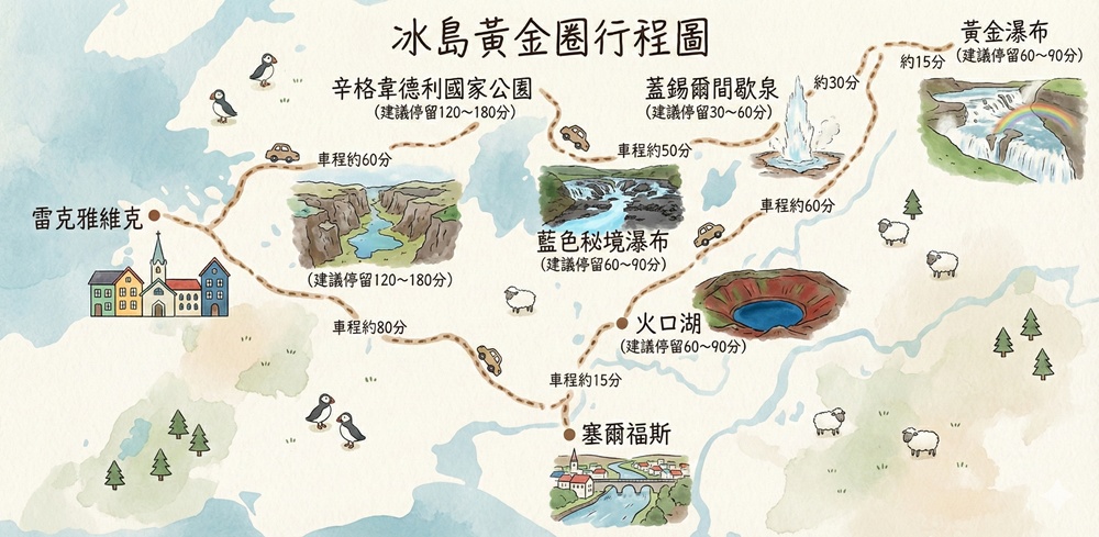 黃金圈五大景點與周邊城市相對位置如下(其中雷克雅維克(Reykjavik)、塞爾福斯(Selfoss)是靠近黃金圈主要城市)。喵爸標註上大概交通時間與建議停留時間,你會發現一整天會剛好可以繞一圈。