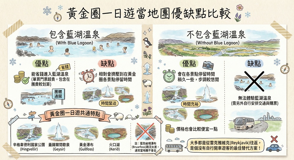 有包含藍湖溫泉:能省錢進入藍湖溫泉(不然單買門票超貴),但相對會擠壓到在黃金圈停留時間