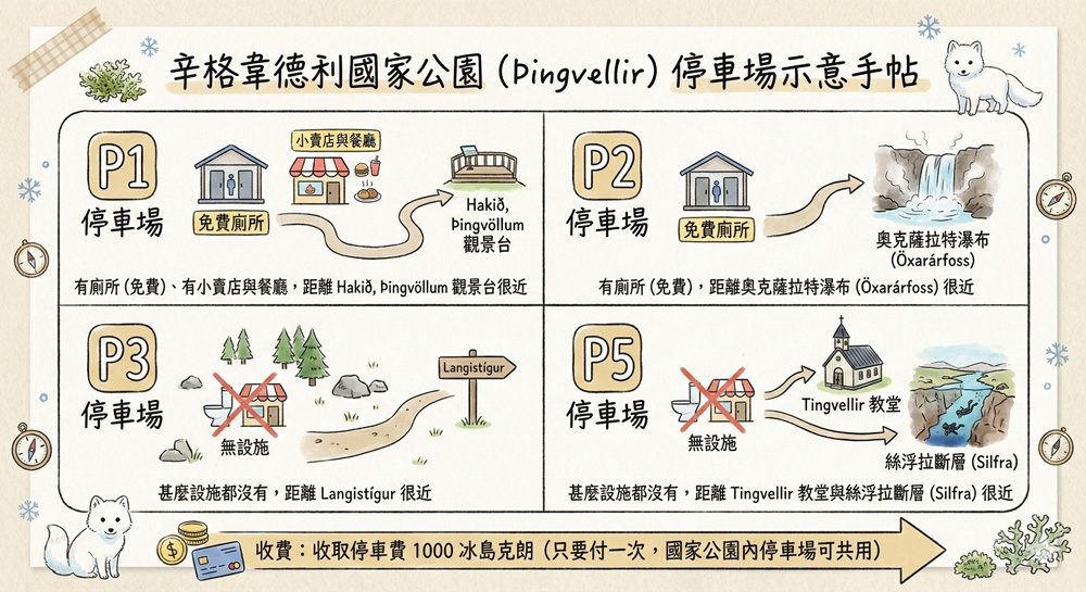 收費:收取停車費1000冰島克朗(只要付一次,國家公園內停車場可共用),停車場(P1、P2、P3、P5)
