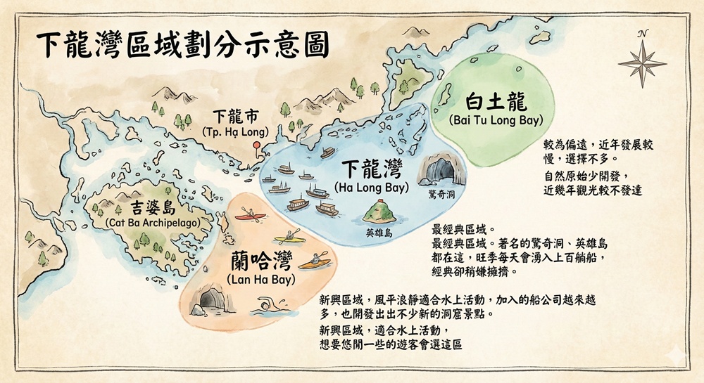 下龍灣大致可分為下龍灣(Ha Long Bay)、蘭哈灣(Lan Ha Bay)、白土龍(Bai Tu Long Bay)三個區域