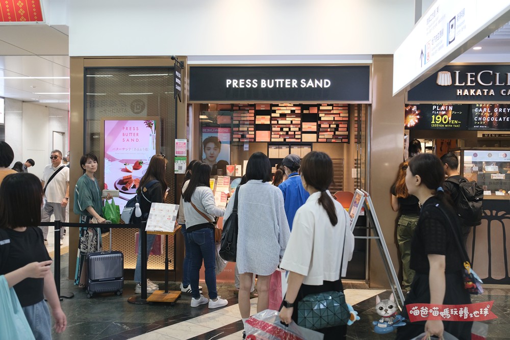 PRESS BUTTER SAND的夾心餅乾、TRAINDOR明太子法棍、LeClerc的可麗露,這三樣普遍被認為是博多車站內走過路過不能錯過的點心,三家店舖就緊緊相連、位置就在最主要通道,並不難找。