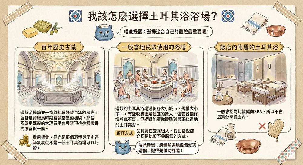 土耳其浴場大概可以分成三種分別是:飯店內附屬的浴場、百年歷史古蹟與一般民眾使用的浴場。其中飯店內附屬的土耳其浴一般會認為比較偏向SPA,所以不在這篇分享範圍內。