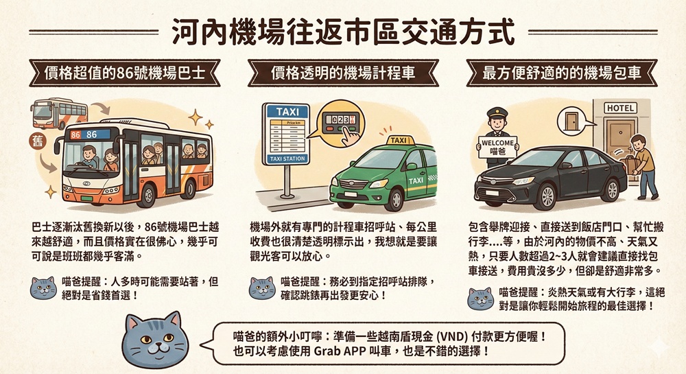 便宜超值的86號巴士(Bus Express 86 Hanoi)、價格透明的計程車、服務到位的機場包車,河內機場往返市區的交通,說起來非常簡單好懂。