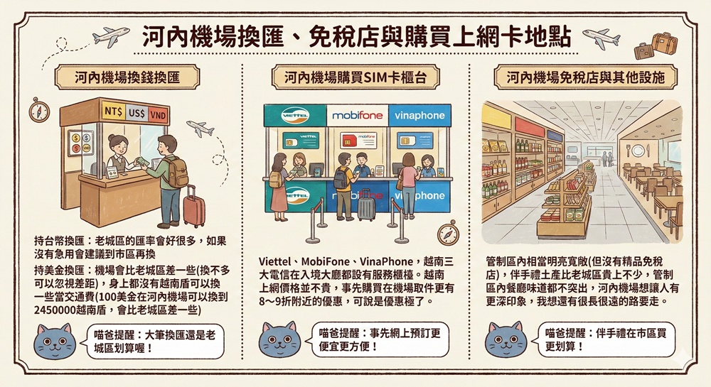 從機場往返市區交通、機場換錢換匯、購買SIM卡與免稅店,這篇就聚焦在河內機場的大小事上吧。