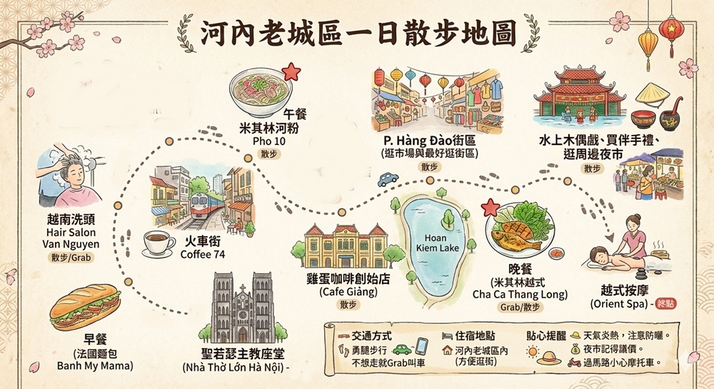 行程:聖若瑟主教座堂周邊(Nhà Thờ Lớn Hà Nội)>>早餐(法國麵包 Banh My Mama)>>火車街(Coffee 74)>>越南洗頭(Hair Salon Van Nguyen)>>午餐(米其林河粉 Pho 10)>>雞蛋咖啡創始店(Cafe Giảng)>>P. Hàng Đào(逛市場與最好逛街區)>>晚餐(米其林越式 Cha Ca Thang Long)>>水上木偶戲、買伴手禮、逛周邊夜市>>越式按摩(Orient Spa)