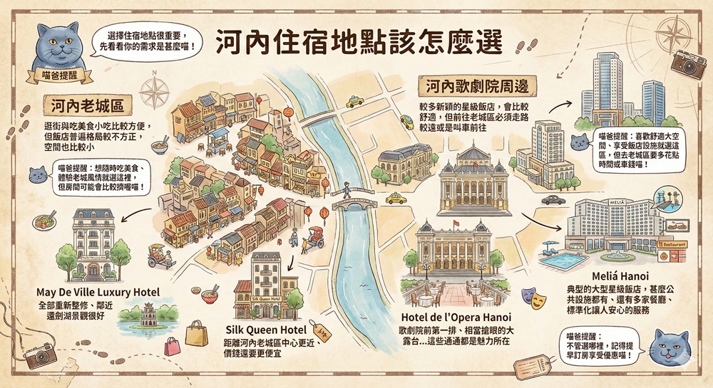 河內老城區與河內歌劇院(Nhà hát Lớn Hà Nội)周邊,這兩個就是前來河內旅遊最推薦的住宿區域。河內歌劇院周邊較多4~5星的高檔飯店,老城區裡面則是逛街與品嘗美食小吃比較方便,想要住在哪一個區域比較偏向個人喜好。