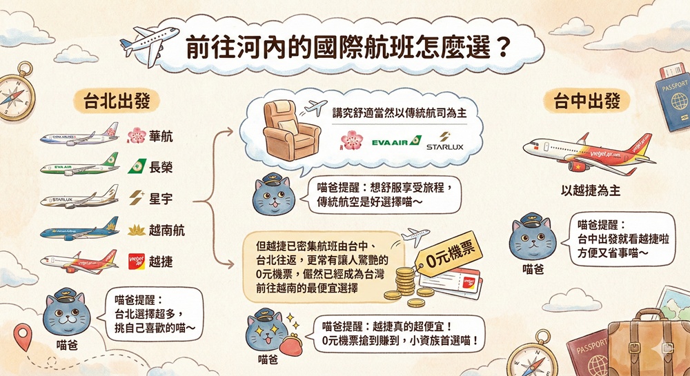 台灣往返河內的空中交通隨著越捷開航變得越來越密集,其中越捷由台中、台北往返,更常有讓人驚艷的0元機票,儼然已經成為台灣前往越南的最便宜選擇