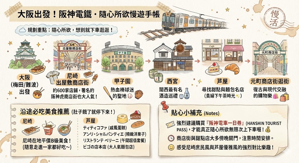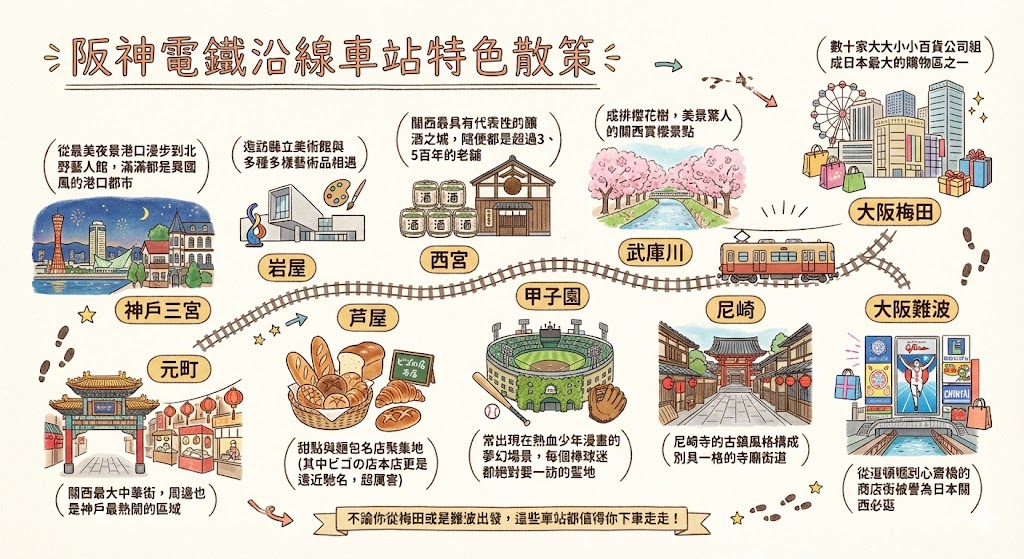 不論你從梅田或是難波出發,尼崎、武庫川、甲子園、西宮、芦屋、岩屋、神戶三宮、元町,這些阪神電鐵沿線車站都值得你下車走走。阪神電車沿線的豐富樣貌,讓你規劃一整天都不夠!