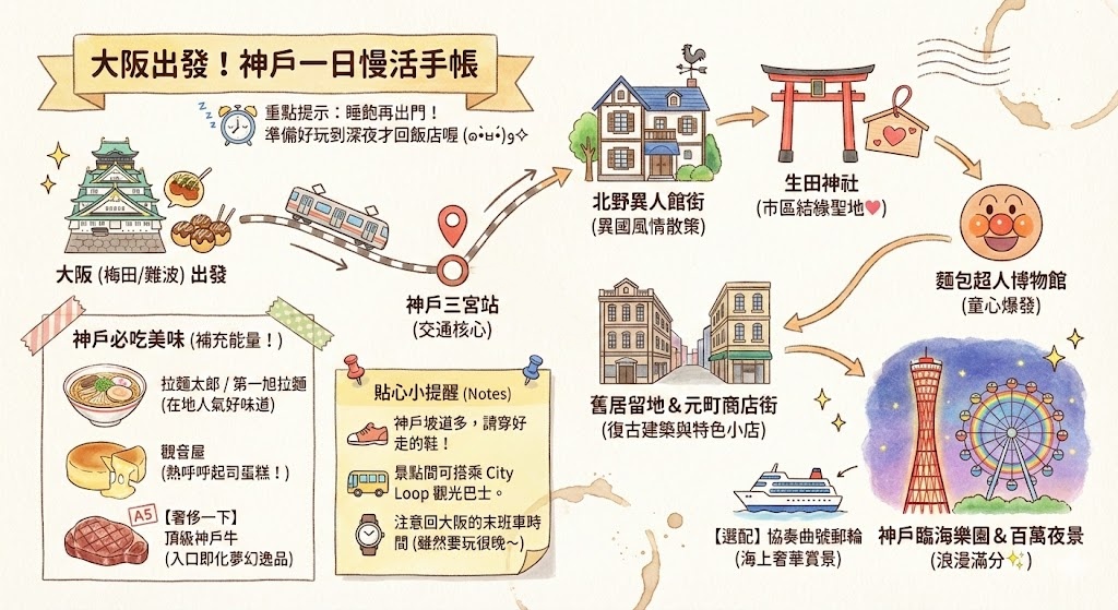 路線:梅田(或難波)>神戶三宮>神戶市區一日遊(北野異人館、生田神社、神戶舊居留地、元町商店街、麵包超人博物館、神戶臨海樂園、神戶港夜景),時間許可還能考慮搭協奏曲號郵輪遊神戶港。