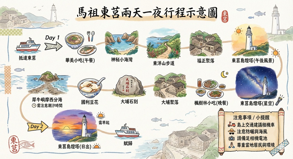 Day1:華美小吃(午餐)>神秘小海灣>東洋山步道>福正聚落>東莒島燈塔(午後風景)>犀牛嶼摩西分海>國利豆花>大埔石刻>大埔聚落>楓樹林小吃(晚餐)>東莒島燈塔(星空)