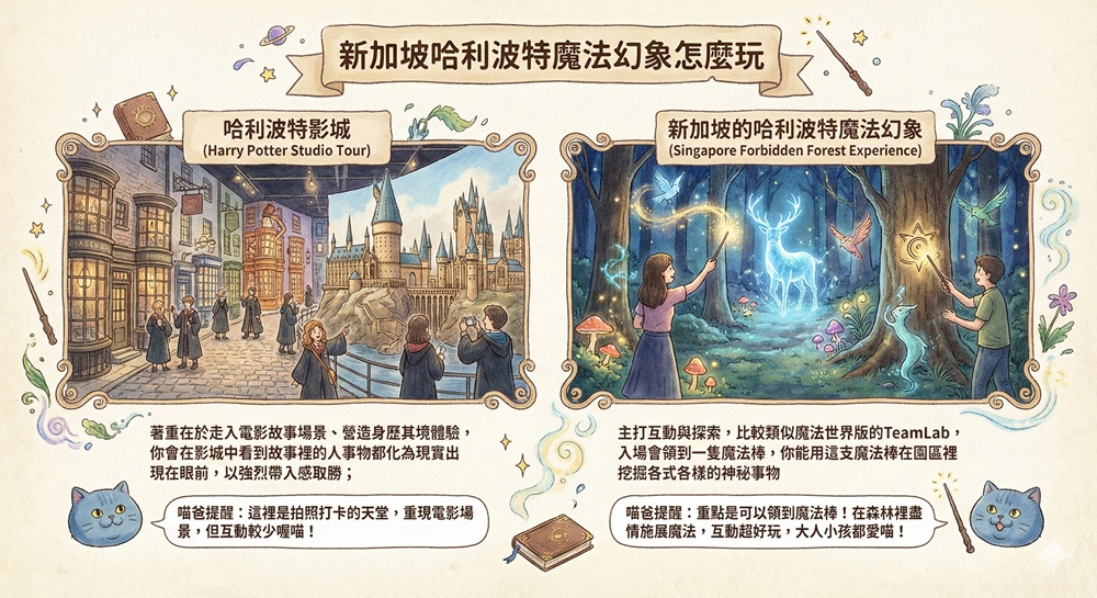 東京的哈利波特影城著重在於走入電影故事場景、極力營造身歷其境體驗,你會在影城中看到故事裡的人事物都化為現實出現在眼前,以強烈帶入感取勝;而新加坡的哈利波特魔法幻象(Harry Potter:Visions of Magic)主打的則是互動與探索,比較類似魔法世界版的TeamLab,兩者可說是大不相同。