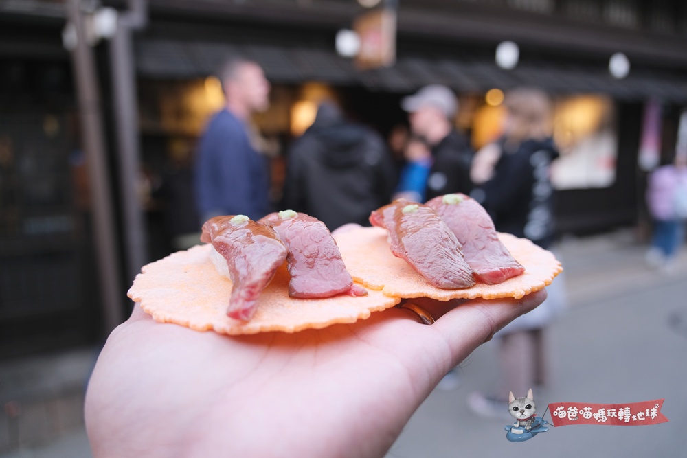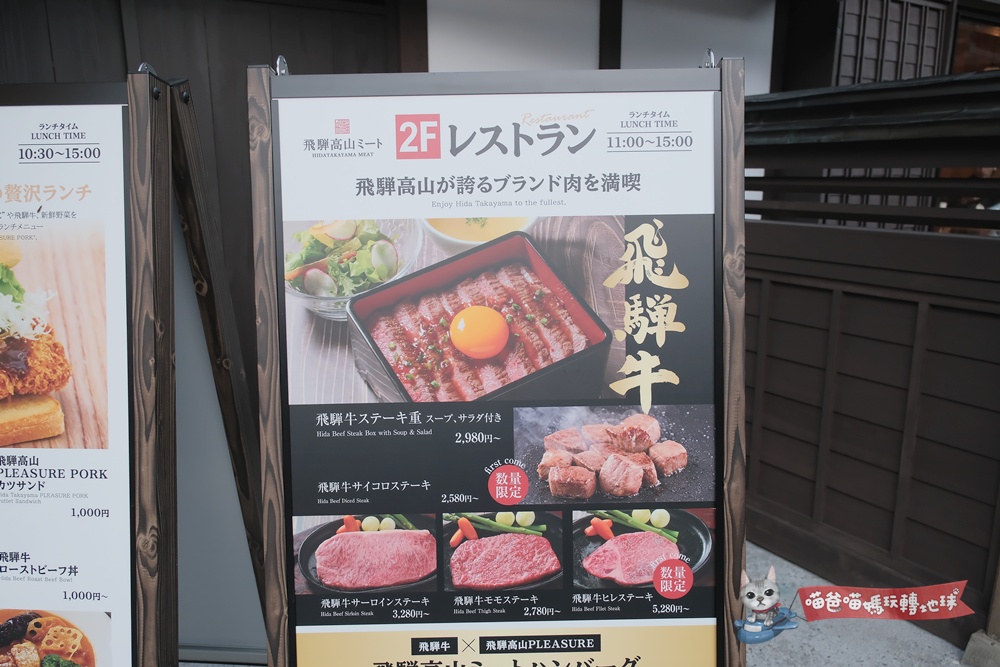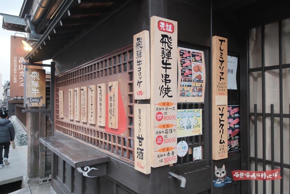 高山三町通老街(さんまち通り)上也有不少販售飛驒牛串燒、飛驒牛丼飯,但老實說這些就沒有那麼推薦,原因之一就是肉質可能都沒那麼好,原因之二就是價格不夠實惠,喵爸基本上都不太推薦。