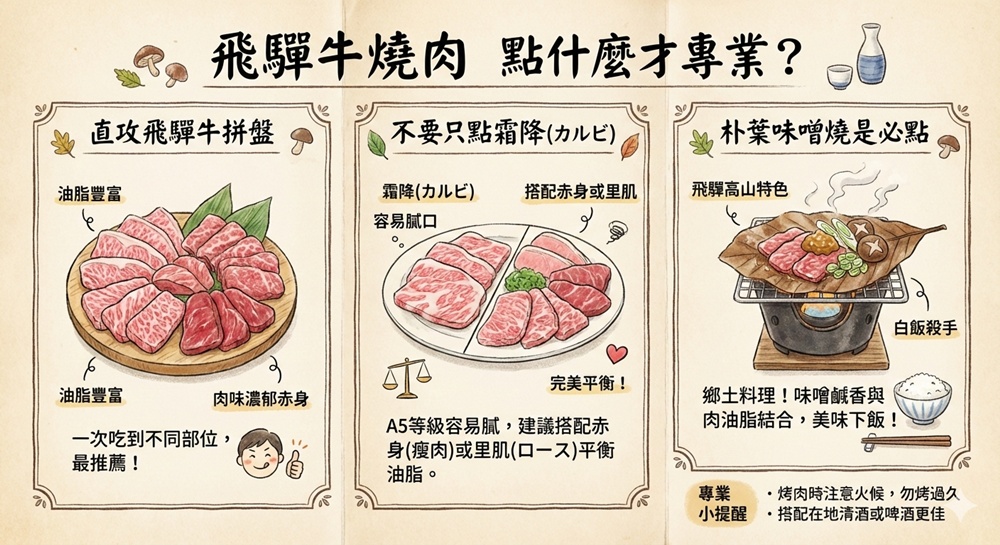 不要只點霜降(カルビ):A5等級的和牛非常容易膩口,建議搭配一些赤身(瘦肉)或里肌(ロース)