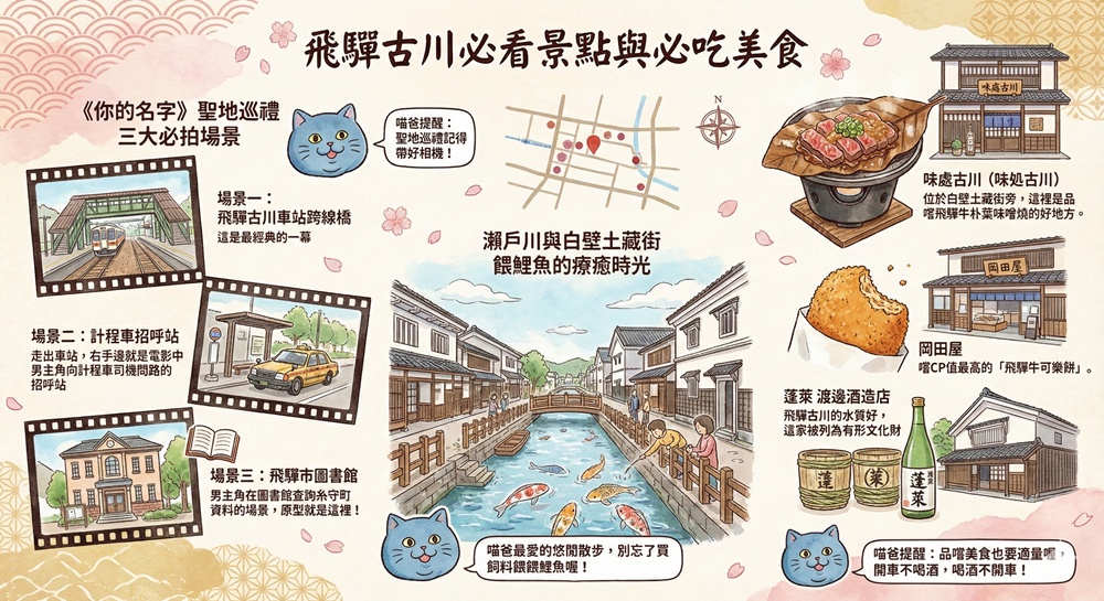 飛驒古川不只是動畫電影《你的名字》中男主角尋找女主角的關鍵場景,更是擁有千年歷史、保留最完整日本風景的「工匠之鄉」,這篇就跟著喵爸喵媽,來趟充滿電影感與飛驒牛香氣的飛驒古川半日散步吧。
