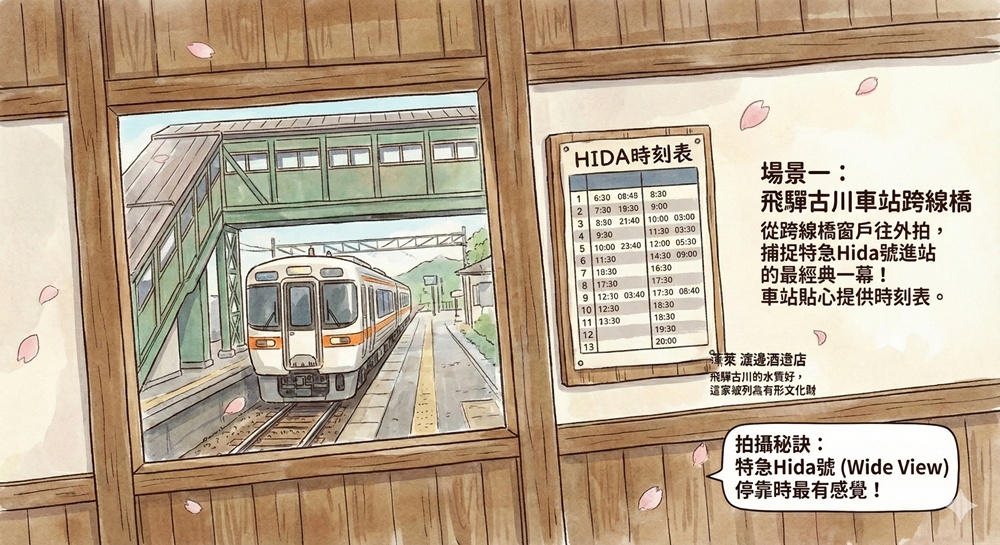 場景一:飛驒古川車站跨線橋。瀧(男主角)來到飛驒尋找三葉時,站在車站天橋上看著列車進站的畫面。 想拍出跟電影一模一樣的角度,記得要走到車站內的跨線橋,並透過窗戶往鐵軌方向(車站很貼心地貼出了列車進站時刻表,讓大家可以算準時間捕捉列車停靠的瞬間)