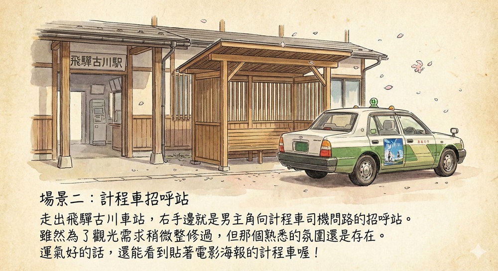 場景二:計程車招呼站。走出飛驒古川車站,右手邊就是男主角向計程車司機問路的招呼站。雖然為了觀光需求稍微整修過,但那個熟悉的氛圍還是存在。運氣好的話,還能看到貼著電影海報的計程車喔!