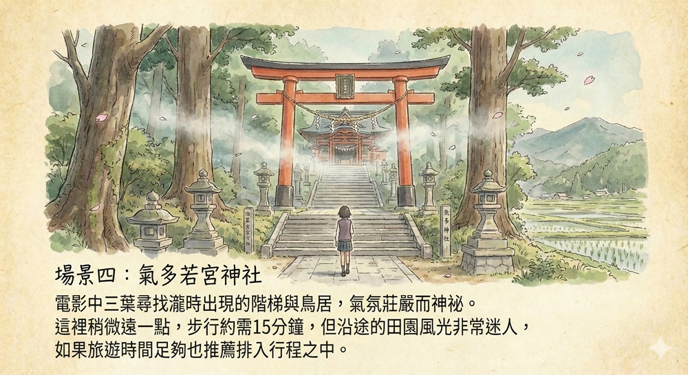 場景四:氣多若宮神社。電影中三葉尋找瀧時出現的階梯與鳥居,氣氛莊嚴而神祕。這裡稍微遠一點,步行約需15分鐘,但沿途的田園風光非常迷人,如果旅遊時間足夠也推薦排入行程之中。
