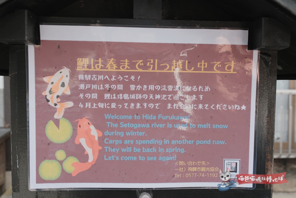 瀨戶川裡放養了約千隻鯉魚,每一隻都被養得肥嘟嘟的,路邊更隨處都可以看到販售魚飼料的誠實商店,投個100日幣就能買一包魚飼料,狂撒飼料餵飽這些鯉魚,這可說是來到飛驒古川不可錯過的大事。