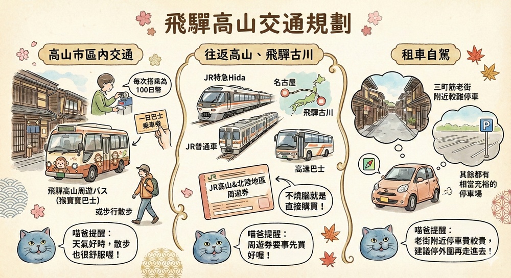 高山市區交通主要仰賴飛騨高山周遊バス(又稱猴寶寶巴士)或是步行散步。從名古屋前往高山或往返飛驒古川則是以JR特急與高速巴士為主。