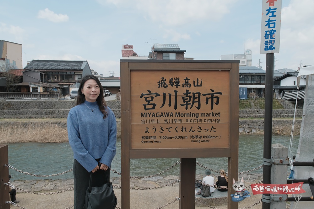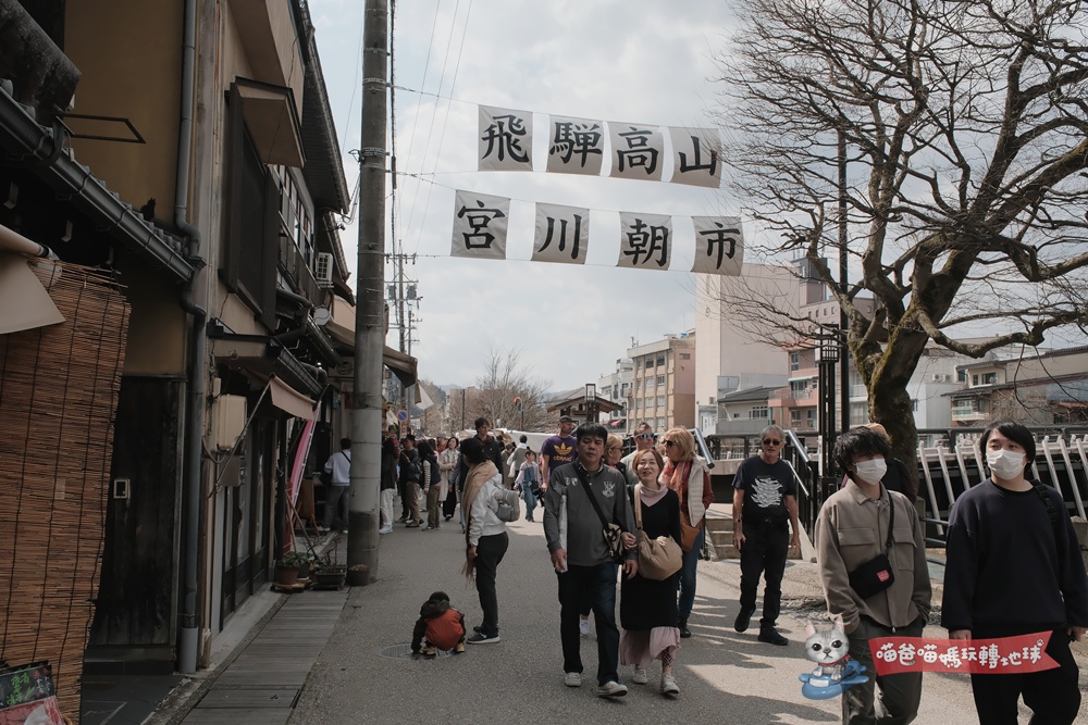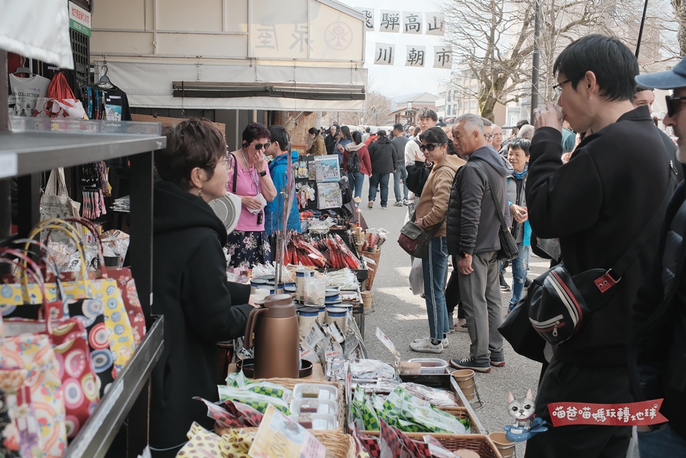 每天早上7點到中午12點,當地農家與店家就會沿著河岸擺攤。除了新鮮的蔬菜水果以外,為了應付越來越多觀光客也慢慢出現熱騰騰的飛驒牛包子、非常火紅的餅乾拿鐵與各式各樣可以馬上解饞的小吃。