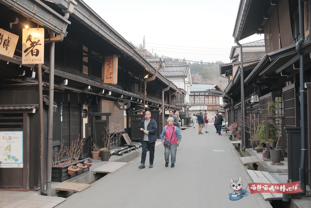 從飛驒之里就能搭乘「猴寶寶巴士」來到高山最熱鬧的「三町筋老街」周邊。 這裡保留了江戶時代的木造建築群,黑色格柵搭配流動的水路,除了氣氛滿分以外,也是老饕的美食天堂!