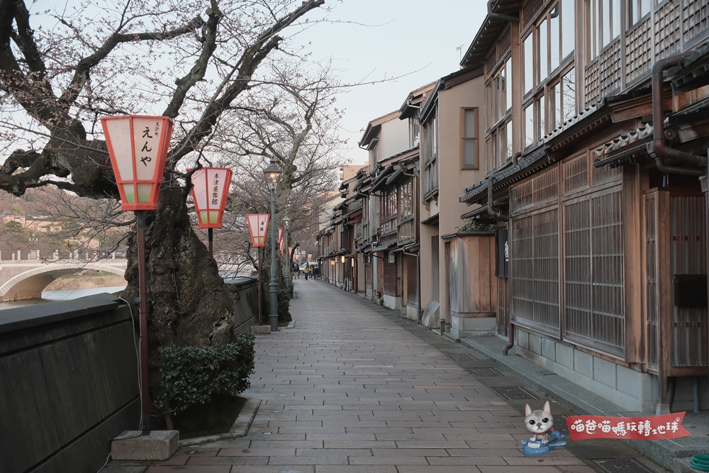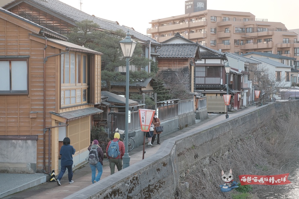 跨過淺野川大橋,左手邊那一排沿著河岸延伸的木造建築群,就是主計町茶屋街。