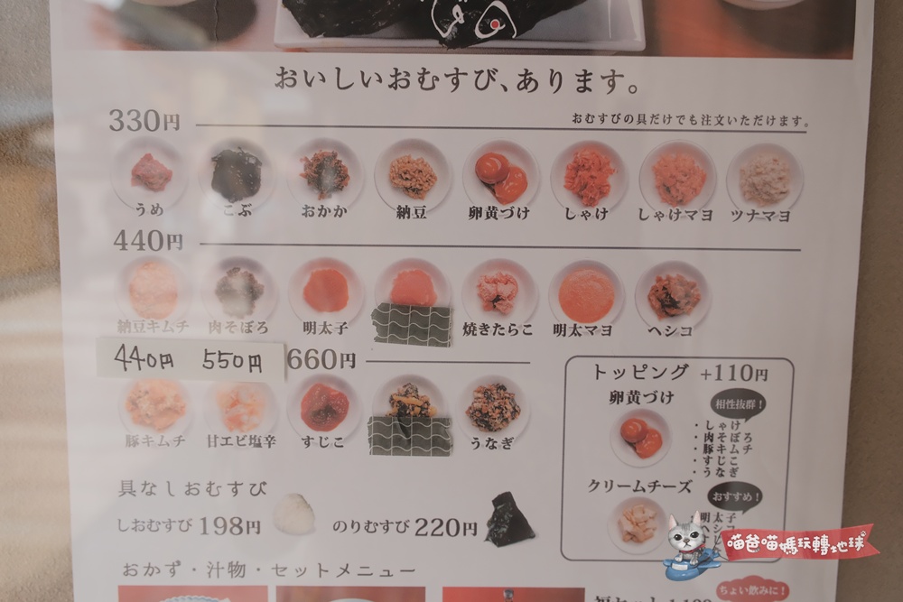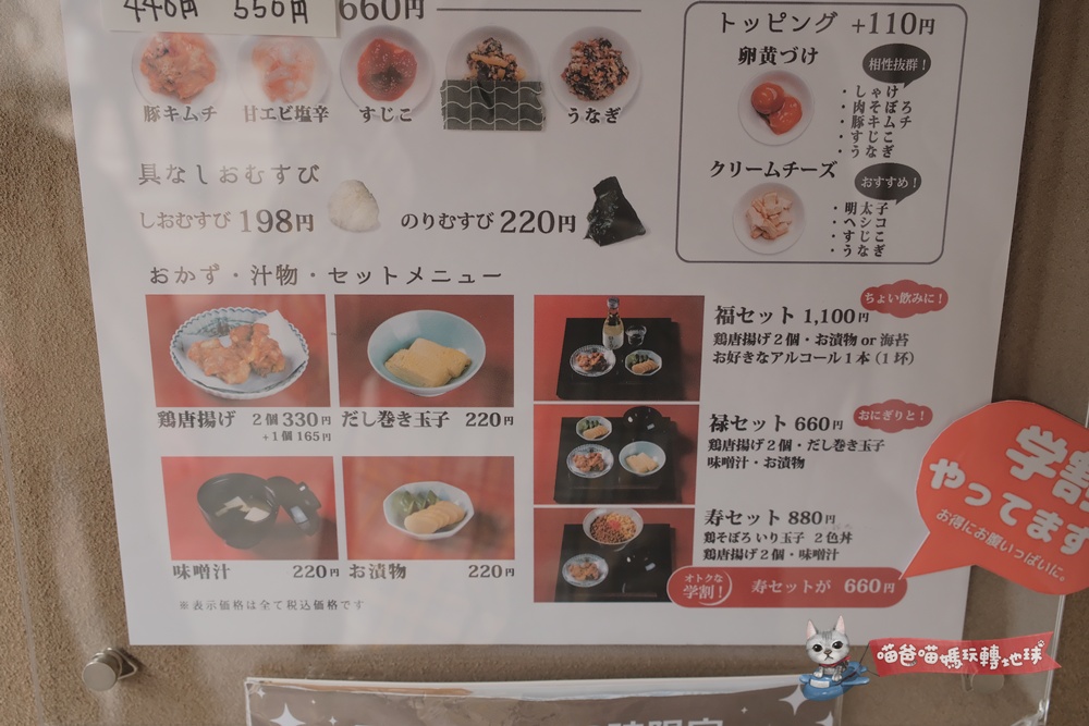 環境古色古香的禄むすび(Roku Musubi)可說是氣氛絕佳,販售品項就是以飯糰為主的各式各樣定食(當然飯糰也可以單點),價格不便宜但用料實在、口味樸實,喵爸個人覺得是偏向體驗氣氛解成就概念