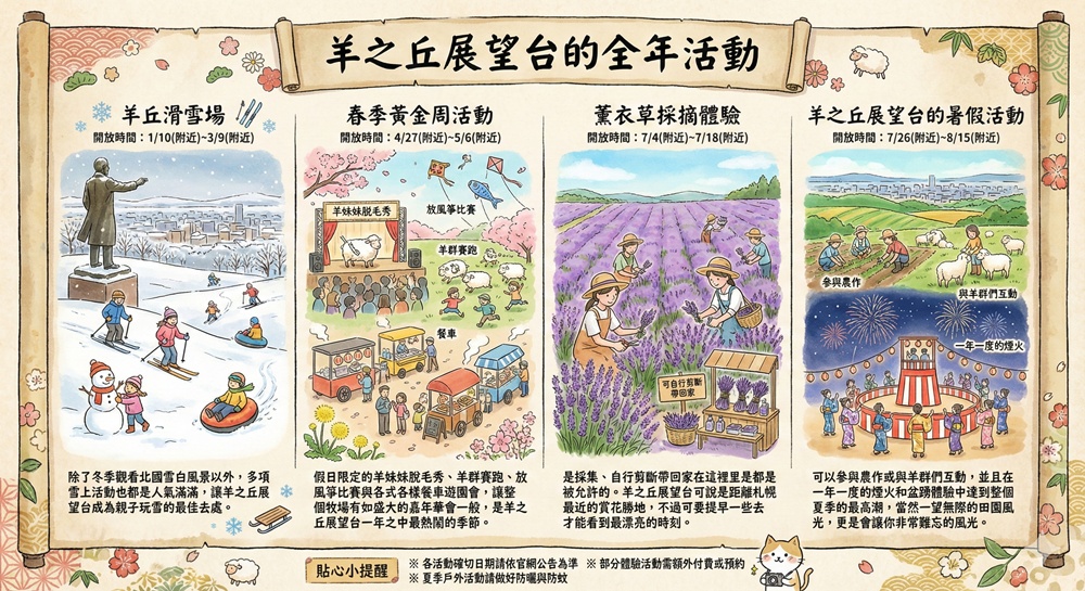 羊之丘展望台位於札幌市郊,這裡除了是個能遠望四週、風景極好的制高點以外,更因為四季不同多樣活動而被譽為札幌必遊的親子景點。