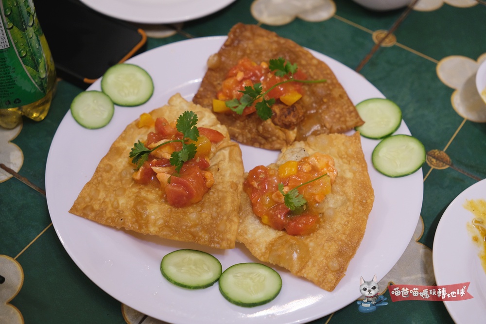 炸雲吞(Fried Wonton):酥脆的雲吞皮上鋪滿了番茄、鳳梨與洋蔥炒成的酸甜佐料,吃起來比較像是一道開胃小點心,非常適合配啤酒。