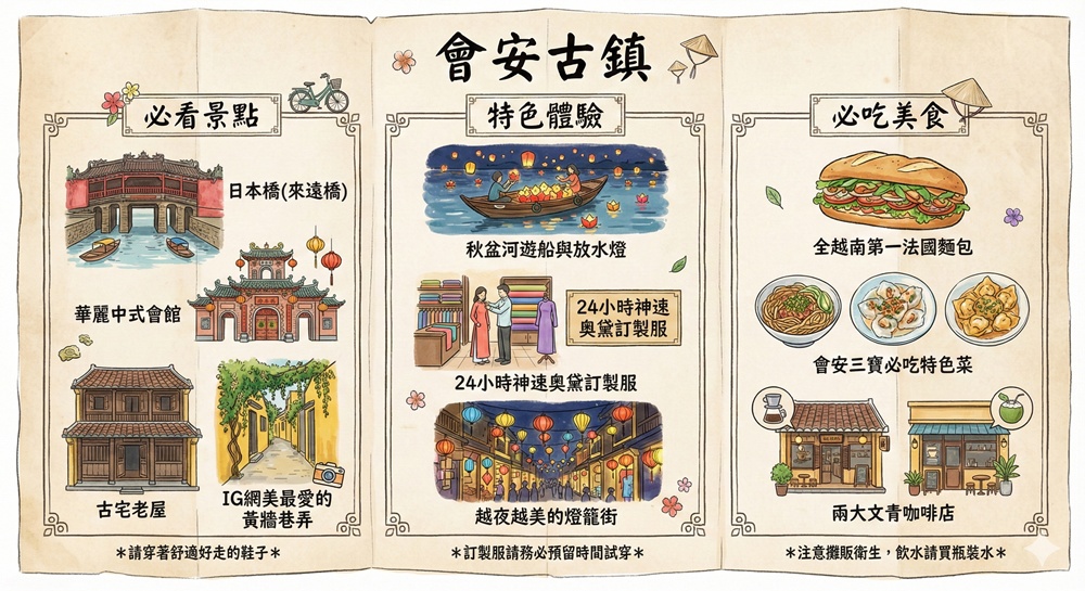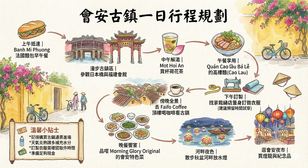 行程建議:上午先買個法國麵包當早餐>漫步古鎮區,參觀日本橋與福建會館>到Mot Hoi An買杯荷花茶解渴>午餐享用高樓麵(Cao Lau)>下午找家裁縫店量身訂做衣服>去喝網美咖啡看古鎮全景>晚餐品嚐會安特色菜>到秋盆河畔放水燈>逛會安夜市買燈籠與紀念品。