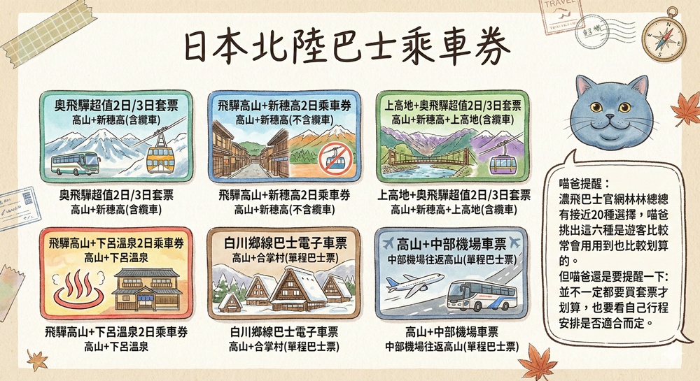 濃飛巴士官網有接近20種交通票券可以選擇,喵爸挑出的這六種是遊客比較常會用到也比較划算的。但喵爸還是要提醒:並不是一定要買交通套票才會划算,適不適合要看自己行程安排而定。