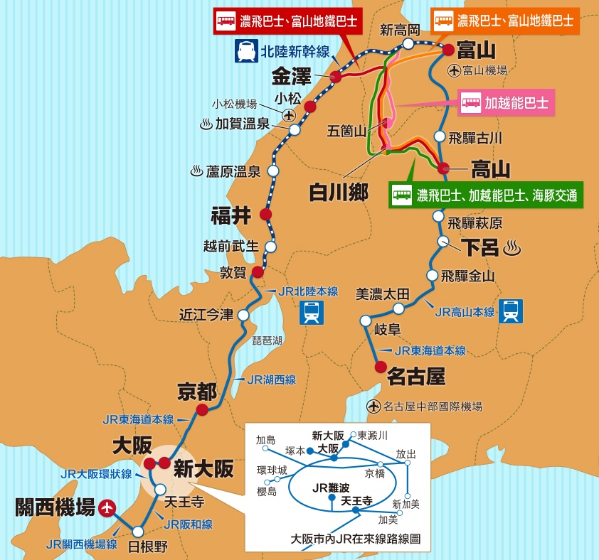 JR:名古屋站~富山站、敦賀站~京都站~大阪市內、大阪市內~關西機場