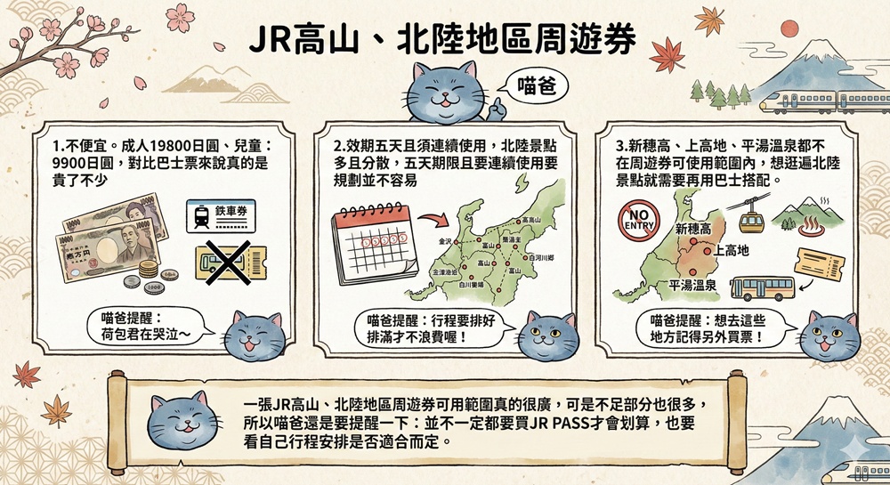 一張JR高山、北陸地區周遊券可用範圍真的很廣,可是不足部分也很多,所以喵爸還是要提醒一下:並不一定都要買JR PASS才會划算,也要看自己行程安排是否適合而定。