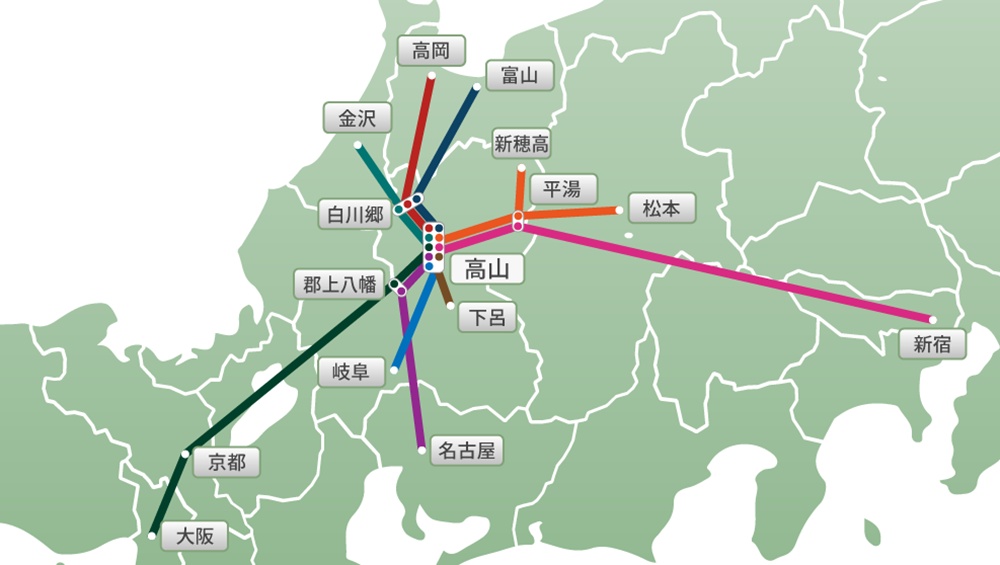 從名古屋機場或小松機場入境以後就前往高山,以高山為中心放射狀搭乘濃飛巴士遊玩周邊景點