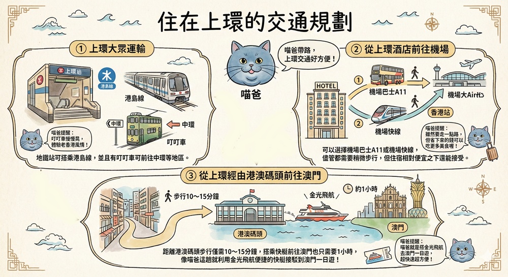 距離港澳碼頭、地鐵上環站都不遠,不管是搭乘快艇前往澳門、轉乘地鐵、叮叮車到其他地方都很便利