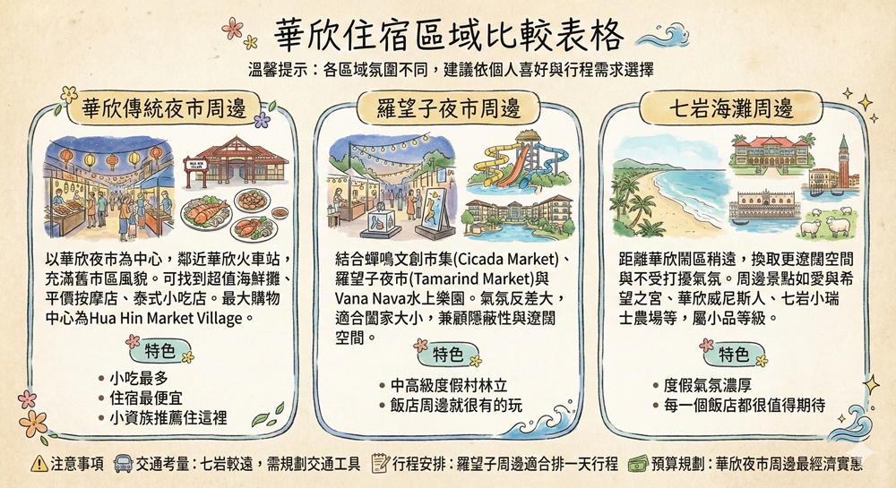 華欣夜市周邊、七岩海灘周邊、羅望子夜市周邊,這三個就是華欣最熱門的住宿區域。會選擇來到華欣就是想要享受度假氣氛,也因此在飯店的時間會比較長,選擇比較好的飯店是非常值得的事。