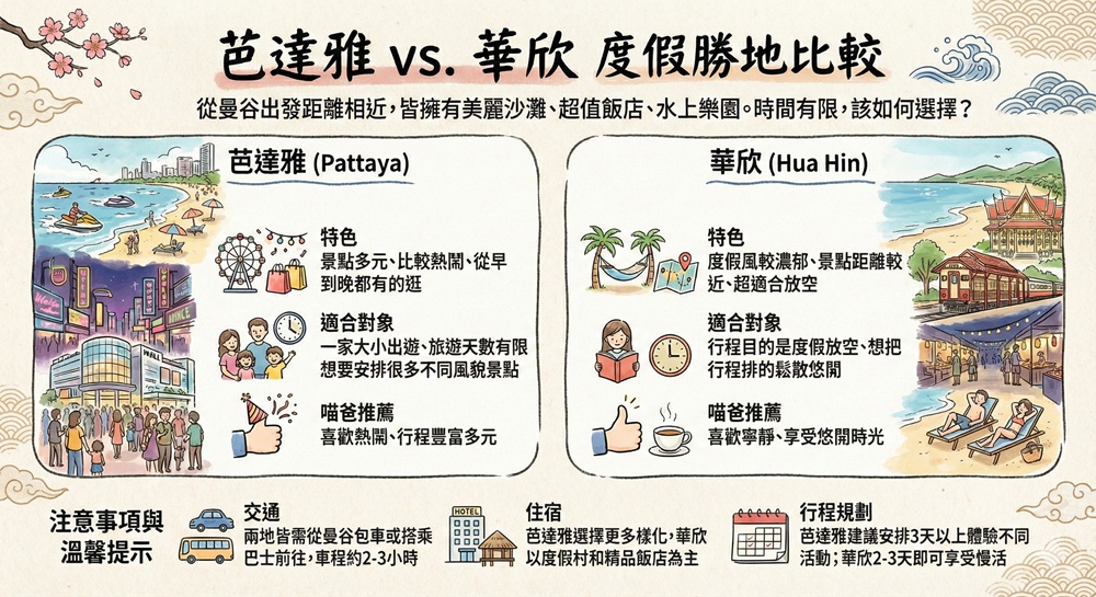 如果你是一家大小出遊或是旅遊天數有限想要安排很多不同風貌景點,喵爸會推薦芭塔雅;相反的如果你的行程目的是度假放空、甚至於想把行程排的鬆散悠閒一些,這樣我就會推薦華欣^^