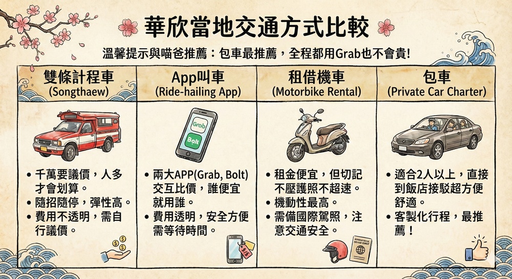 華欣當地交通可以分為雙條計程車、App叫車、租借機車與包車四種方式。喵爸個人一樣最推薦包車,像華欣這麼慵懶適合度假的地方,全部交給不貴的包車就是最方便的方式。