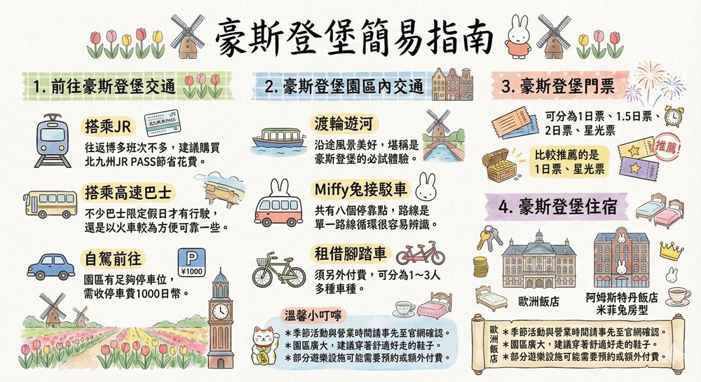 前往豪斯登堡巴士、JR、自駕都很方便;門票有販售星光票、一日票、兩日票多種選擇;住宿則是園區範圍內選擇多多通通都很不錯,規劃前往豪斯登堡你會想要停留多久?