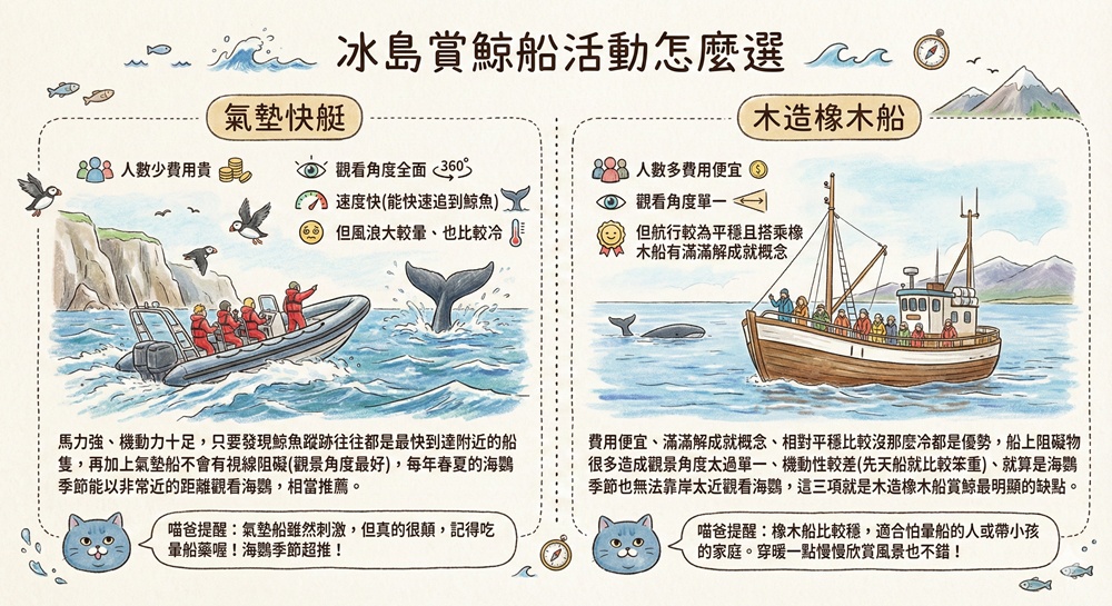 冰島賞鯨船會有兩種,一種是空間較為緊迫的氣墊快艇,另一種則是由漁船改建的傳統木造橡木船,兩種各有優缺點,選擇哪一種比較偏向個人喜好。