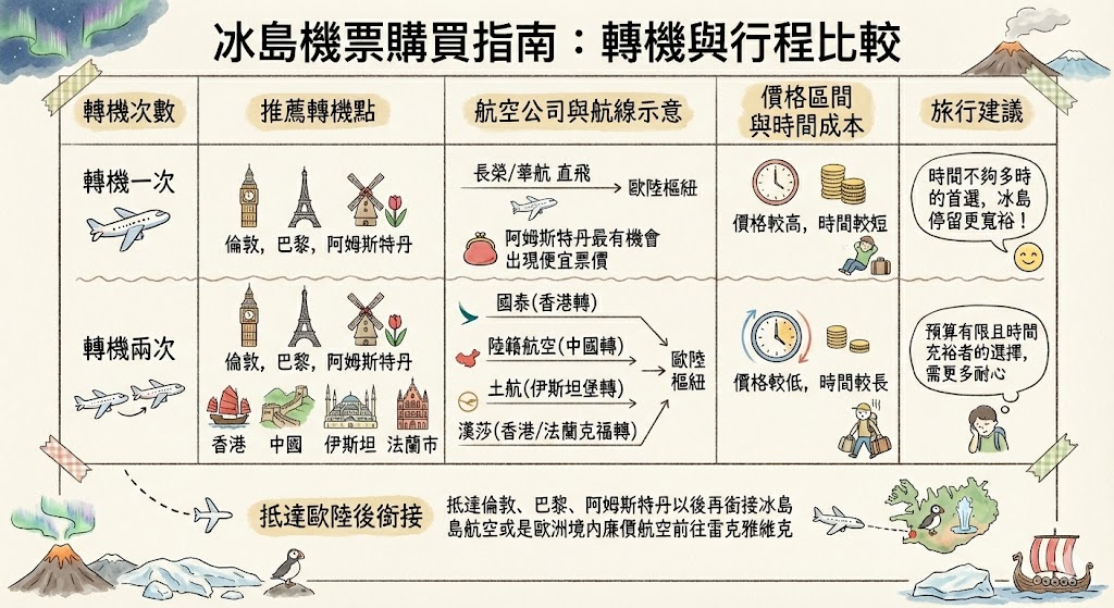 前往冰島並沒有直飛航班,轉機越多次就會越便宜,但相對就會壓縮在冰島的停留時間。