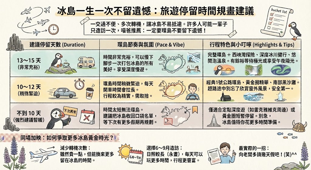 如果時間不到10天:時間太短無法環島,先放棄,等以後有更多假期再規劃冰島旅行吧。