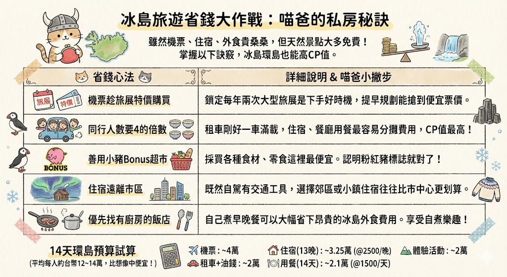 冰島機票、住宿、餐廳外食、參加活動非常昂貴,但景點只需付停車費、租車與停車收費都還能接受,這裡就讓喵爸分享幾個冰島旅遊省錢的秘訣。