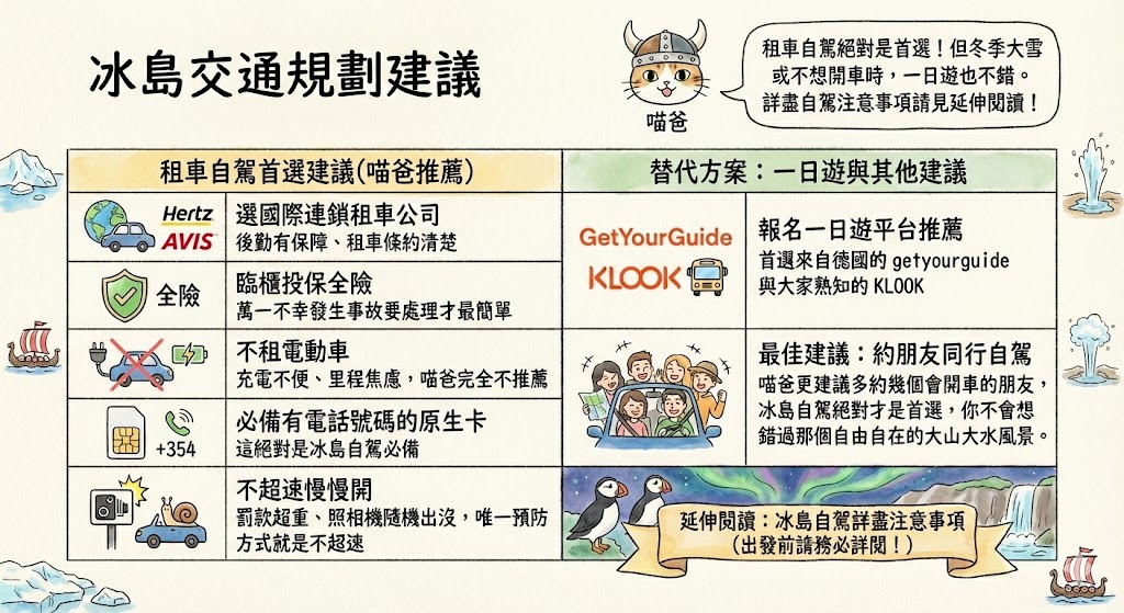 租車自駕絕對是冰島最推薦的交通規畫首選,但冬季大雪交通不便適度報名一日遊也是不錯的方式,喵爸把最詳盡的冰島自駕注意事項放在延伸閱讀之中,出發前可千萬要詳加閱讀一番。