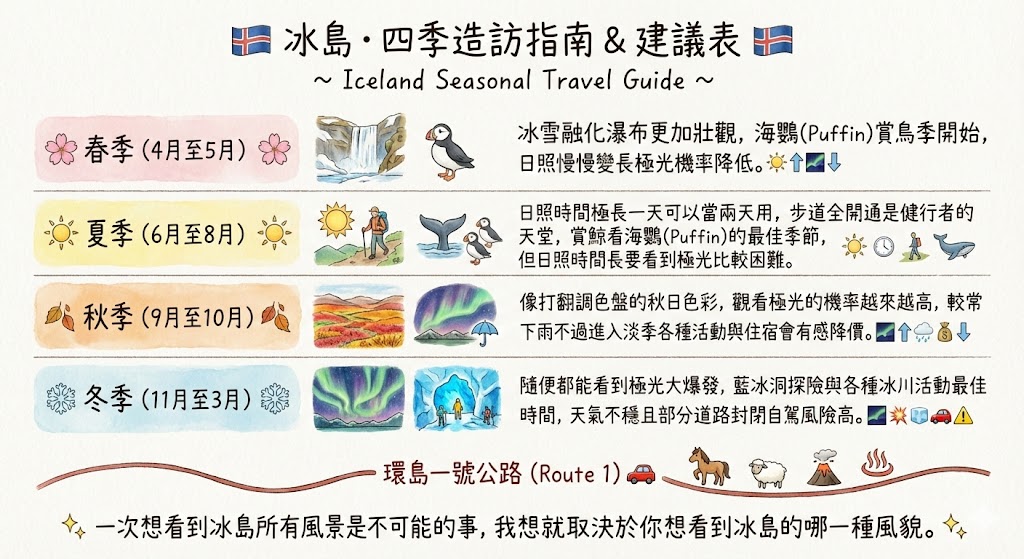 冬季 (11月至3月):隨便都能看到極光大爆發,藍冰洞探險與各種冰川活動最佳時間,天氣不穩且部分道路封閉自駕風險高。
