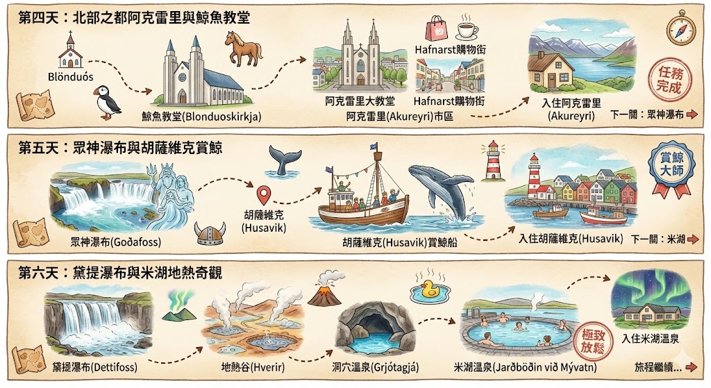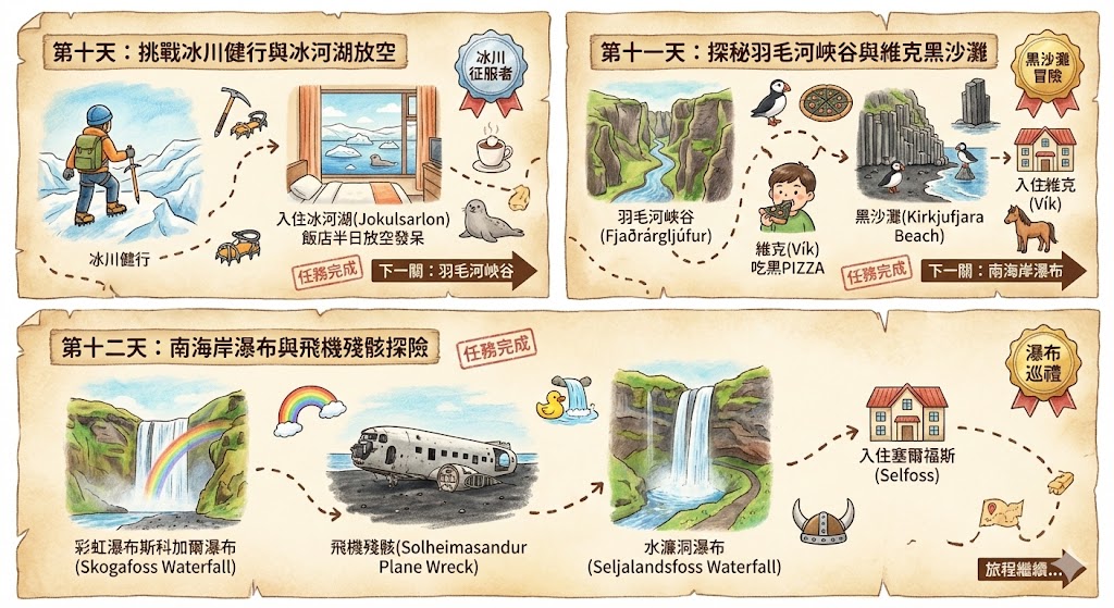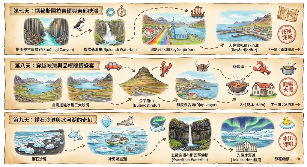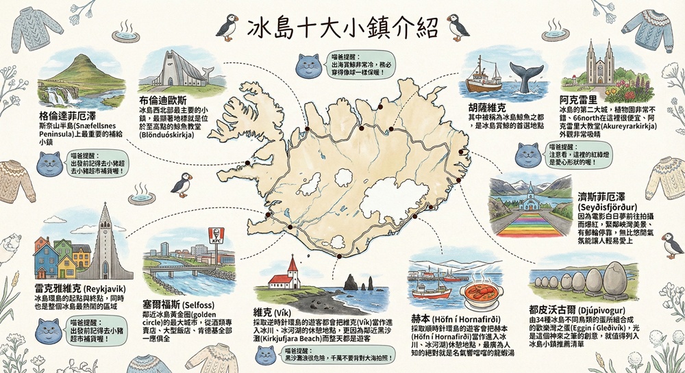 雷克雅維克市區(Reykjavík)、藍湖溫泉(Blue Lagoon)、黃金圈(Golden Circle)、飛機殘骸(Solheimasandur Plane Wreck)、黑沙灘(Kirkjufjara Beach)、羽毛河峽谷(Fjaðrárgljúfur)、冰河湖(Jokulsarlon)、斯圖拉吉爾峽谷(Stuðlagil Canyon)、米湖溫泉(Jarðböðin við Mývatn)、胡薩維克(Husavik)賞鯨看海鸚、巨人峽谷(Kolugljúfur)、教會山(Kirkjufell)周邊